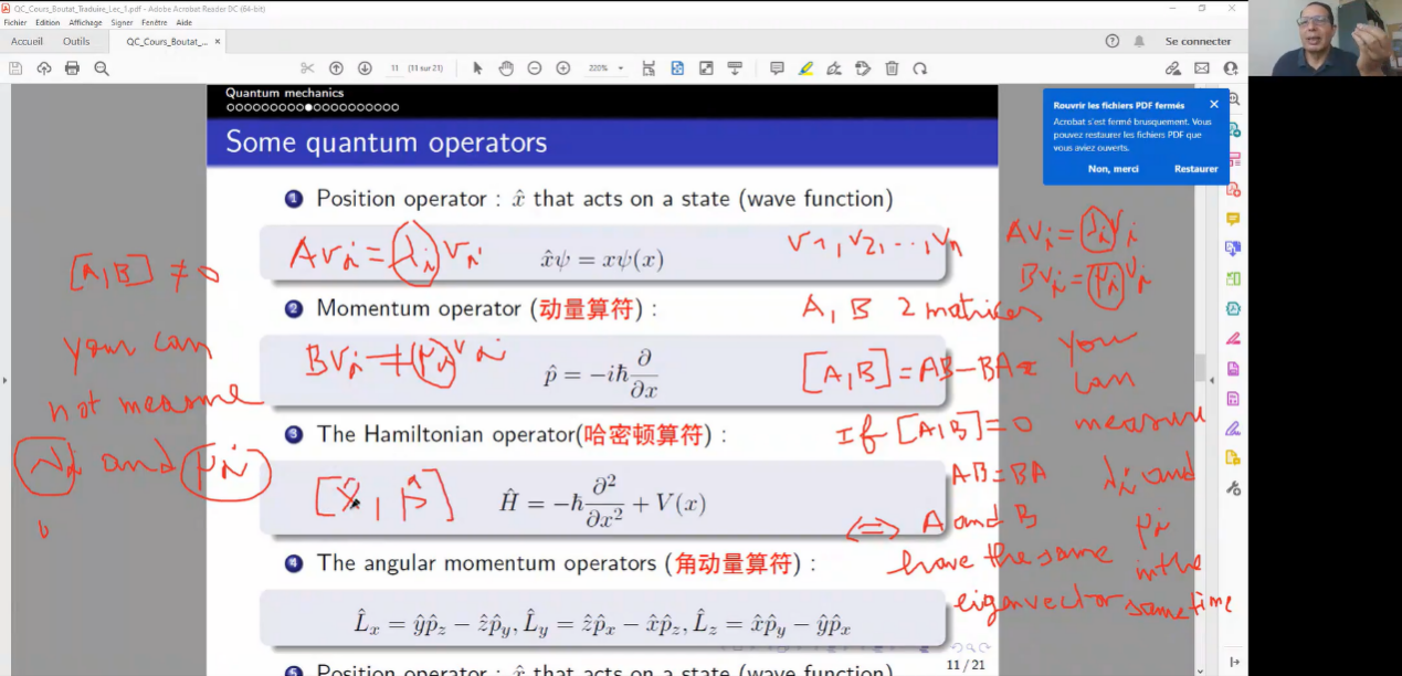 《量子计算简介》主要是介绍实践、发展和掌握量子计算所必需的基本要素。课程开始,Driss BOUTAT教授带领同学回顾量子力学中使用状态概念的一些假设,如Schrödinger方程等,后续课程则主要聚焦于自旋向上和自旋向下的双态系统,和一些常用的量子门计算的具体形式。课程的最后,Driss教授介绍了IBM平台以及如何根据IBM量子计算经验编写算法,让同学们初步接触并感受到量子计算的魅力,也揭开了量子计算的神秘面纱。为避免课程晦涩难懂,Driss教授的讲解都是基于基础的矩阵运算,且在课程中采用PPT结合板书的授课方式。Driss教授事必躬亲的做事方式以及严谨的治学态度,使得同学们受益匪浅,坚定了同学们日后科研的信心。