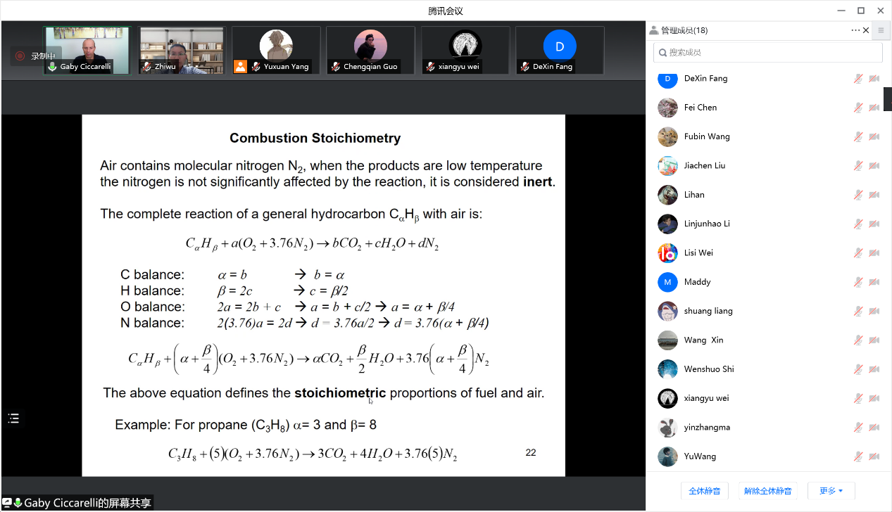 Ciccarelli教授在授课过程中讲解清晰、语速平缓,与学生们积极互动,耐心回答学生的每一个问题,让学生们能在听懂的同时进行更深一步的思考。此外,Ciccarelli教授用一页页逻辑严谨,图文并茂的ppt,针对课程的一些重点和难点问题进行了系统的讲解,同时辅以习题训练,并进行了课堂讲解。通过理论和实践相结合的方式,加深学生们对燃烧学知识的理解。课程结束之后,学生们都对这门课给予了很高的评价。