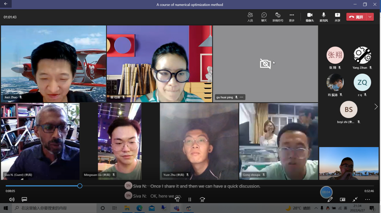 在课程中,Siva副教授首先简要介绍了工程设计中的优化算法的相关背景和概念,给大部分没有接触过优化的学生们搭建了一个整体框架。接下来,逐个介绍了具体的优化方法:二分法,最速下降法,牛顿法等。在授课过程中,Siva副教授使用浅显易懂的实例让高深复杂的理论变得容易理解接受,并对不同方法进行范例对比,从而让易于同学理解不同方法之间的区别和联系。面对同学们提出的问题,也都十分耐心且细致地解答,直至同学们完全理解,这门课程让同学们在此次暑期课堂中受益匪浅。