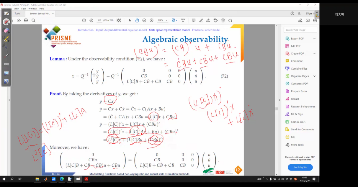 非渐进代数估计方法及其在微分器设计中的应用是一门有关估计变量和处理含有噪声信号的课程。在自动化和信号处理等工程技术中有很多信息不能直接被测量,因此常常需要估计这些变量。由于多数变量的信号在测量过程中均含有误差(噪声),这需要应用的估计方法具有抗噪性。此外,在很多实时应用中,我们需要对未知变量快速估计。针对以上问题,在课程中,Dayan LIU教授介绍了分数阶微积分相关知识,针对线性时变系统、非线性系统、线性奇异系统及分数阶系统进行了详细的介绍,并分别对它们进行可观性分析、标准型转换及有限时间状态估计方法的讲解。在授课过程中,Dayan LIU教授通过对知识内容的独到深入的讲解,达到了很好的教学效果,十分明确并清楚的授课思路使得授课内容更好的被理解接收。