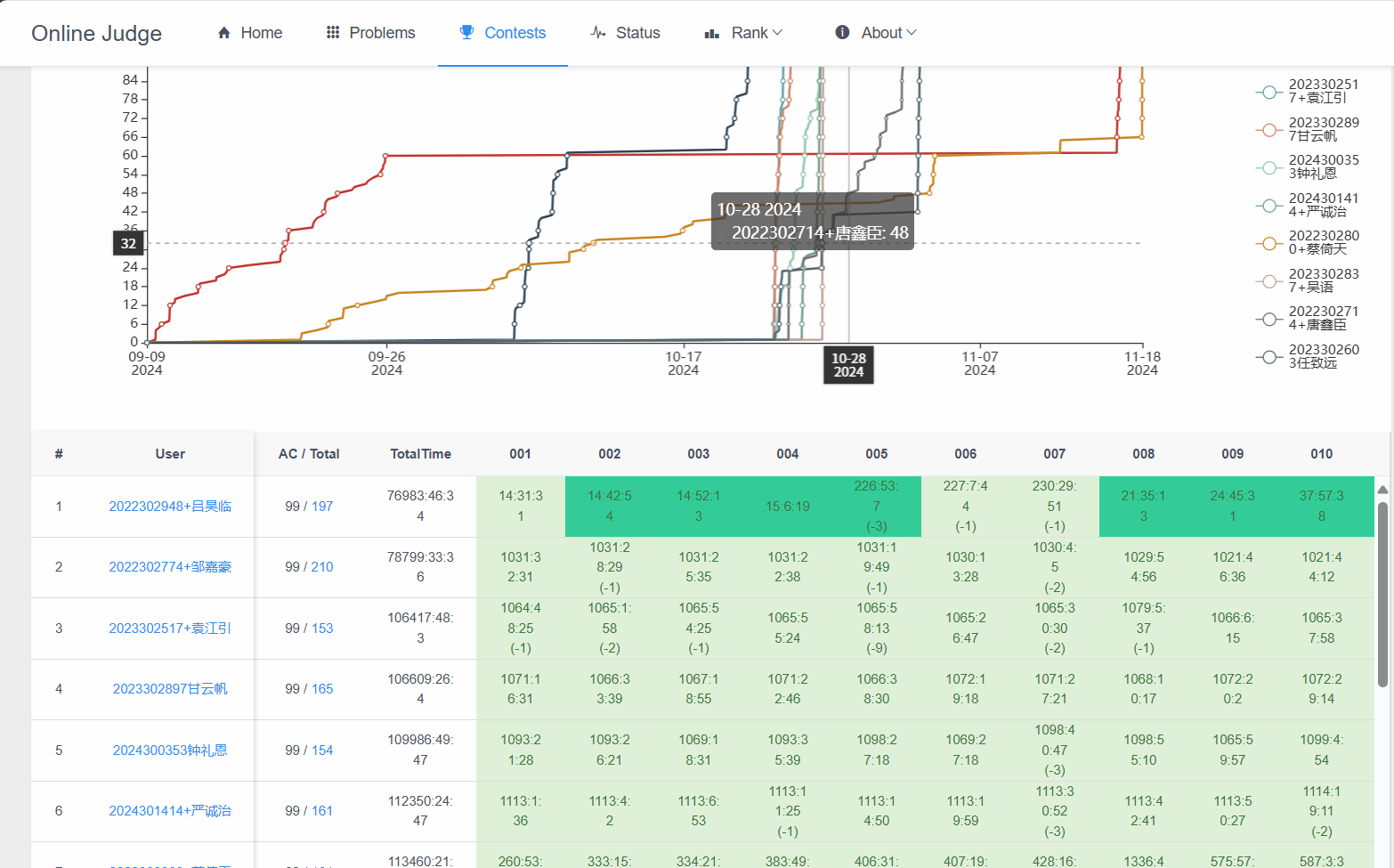 参赛者通过Online Judge 平台进行在线答题。在比赛过程中,同学们充分利用这个平台,不断学习、实践和提升自我。大家在这个平台上交流互动,共同进步,真正实现了 “以赛促学、以赛促教”的目标。