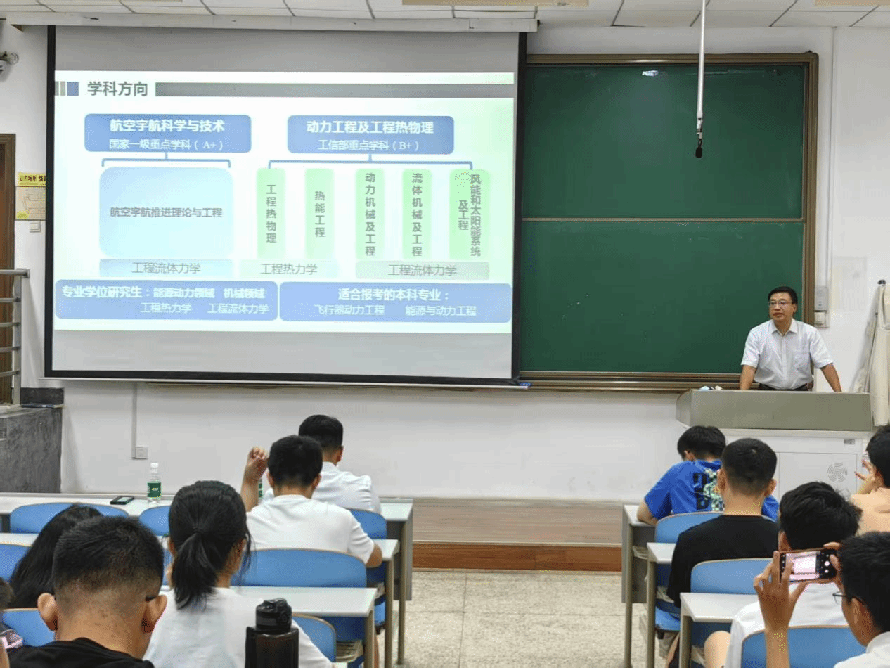 王占学教授作了题为《飞天巡洋、动力先行》的报告,他从学院学科方向、优势资源、优势方向展示了学院在行业内的综合实力。同时他还分析指出了航空动力领域未来广阔的就业前景,帮助同学们坚定考研决心及对行业发展的信心。最后,王占学教授结合考研招生情况分析了当前考研形势,鼓励同学们利用好剩下的半年时间积极认真备考,争取获得满意的成绩。
