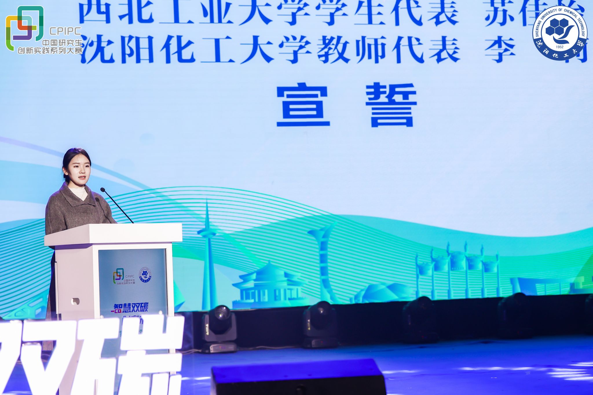 2025级硕士研究生苏佳怡作为唯一参赛学生代表,面向全体评委和师生庄严宣誓,承诺以严谨态度展现创新成果,以奋斗精神践行双碳使命,展现了吃瓜黑料网
