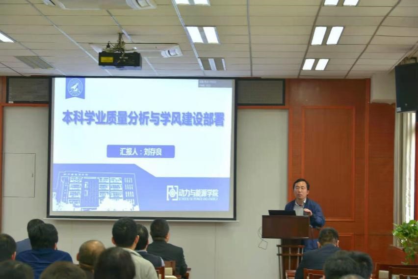 学业情况进行了深入分析、并对学风建设工作进行了全面部署,强调全院教职工要增强学风建设的紧迫感。首先,他从不及格学生人数、不及格科目等数据方面解读了学风建设中的严峻问题。为更好的有的放矢,刘存良从学生角度和学院工作中学生管理、教学体系、学风建设等角度分析了学业问题产生的原因,剖析了当代大学生学习态度、能力和方法的特点,挖掘问题产生的真正原因,因材施教、量体裁衣,精准制定措施,改善学风建设问题。