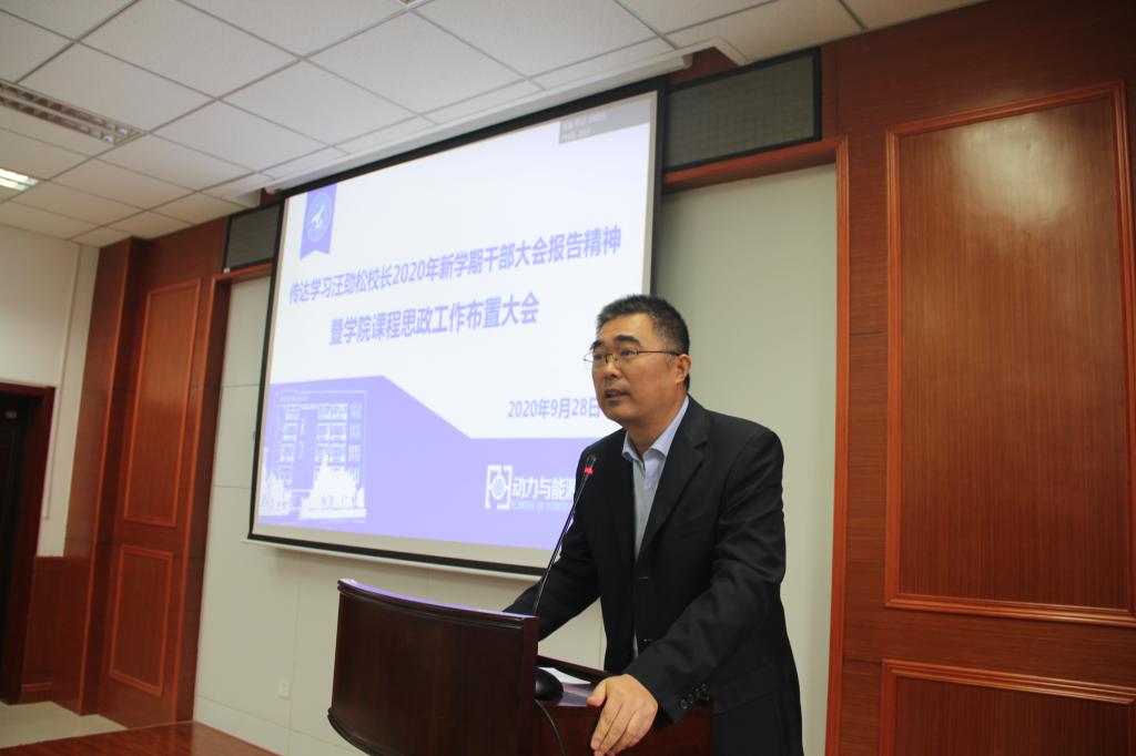 首先,王占学做了题为《以课程思政为抓手,强化三全育人意识,构建动能特色的“三位一体”的育人体系》的报告,从“课程思政与人才培养间的内在联系、学院人才培养与课程思政建设分析和落实学校思政课程与课程思政协同育人工作的具体举措”三个方面解读了学院人才培养模式和课程思政协同育人的举措。他强调,学院将全力开展150+X的专业培养方案模式,用150学分内的学习初步夯实专业基础,使学生具备从事行业工作的基础专业知识和基本工作能力,把班主任和本科生导师制作为这一部分工作的主要抓手,加大班主任和本科生导师的考核力度;用X所代表的“塑魂”、“强基”、“益智”、“健体”、“拓维”为主线,强化人才培养工作中的价值塑造和能力培养,全面提升学院人才培养综合能力,提高人才培养质量。