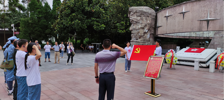 7月17日,师生们来到了红军烈士陵园。走过长长的石梯,高耸的红军烈士纪念碑直指云霄,碑体正中镌刻着由邓小平总理亲笔题写的“红军烈士永垂不朽”八个金色大字,庄重肃穆,令人敬仰。碑体外围是一个大圆环,圆环外壁镶嵌着28颗闪光的星星,象征着中国共产党经过28年艰苦奋斗,取得了全国政权。内壁为4组汉白玉石浮雕,主题分别为“强渡乌江”、“遵义人民迎红军”、“娄山关大捷”、“四渡赤水”。圆环由4个高大的红军头像托着,头像用紫色花岗岩雕刻而成,4个头像分别为老红军形象、青年红军形象、女红军形象和赤卫队员形象,4个雕像分列四周,眼神坚毅望向前方,寓意红军威震四方。在红军烈士纪念碑前,师生们认真瞻仰了红军烈士纪念碑,为红军烈士敬献花篮,并在刘江书记的带领下重温入党誓词。