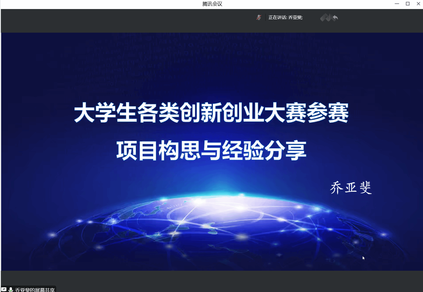 最后,孟宪龙老师向参会学生详细介绍了此次科研见习项目的报名流程、项目类别,提醒同学们及时联系老师,按照计划要求的时间节点完成报名。之后,由乔亚斐同学为同学们分享了竞赛心得,展示了项目构思的心路历程,介绍了各类竞赛项目的写作经验,给出了申报竞赛的实质性建议。