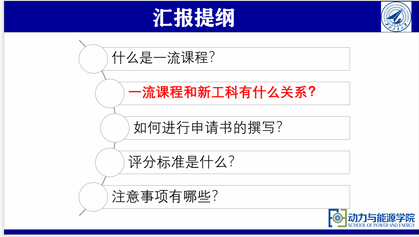 随后,王俨剀就一流课程进行界定,介绍了一流课程和新工科之间的关系,对一流本科课程申请书的撰写流程详细分步解说,重点强调了课程申请时“补短板”、申请导向和课程思政建设等内容的重要性,最终落脚到课程申请的评分标准,提出了线上线下课程混合教学的建议。接下来,各专业课程负责人针对一流课程申报经验进行交流分享。