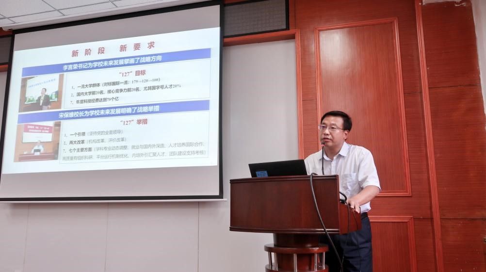 闫育周在总结讲话中表示,今天的全院大会既是对学校新学期干部大会精神的学习贯彻大会,也是学院下半年以至今后一个时期的重点工作推进会。近期学院还将通过新生入学教育、学生大班会、支部会等形式,在全院学生中广泛宣传和思想动员,希望尽快把全院师生的思想和行动统一到学校的办学目标和“双一流”建设的大局上来,积极对照学校“127”目标和举措,找准发展定位,主动担当作为,将核心发展指标逐项逐人落实落细,“千斤重担大家挑,人人肩上有指标”。当前学院处于高质量快速发展的黄金机遇期,党政团结,上下一心,风清气正,发展势头非常好,希望全院师生按照院长的工作部署,锚定目标、趁势而上、踔厉奋发、勇毅前行,全面推动学院高质量快速发展,为学校双一流建设和办学目标的实现做出新的更大贡献。
