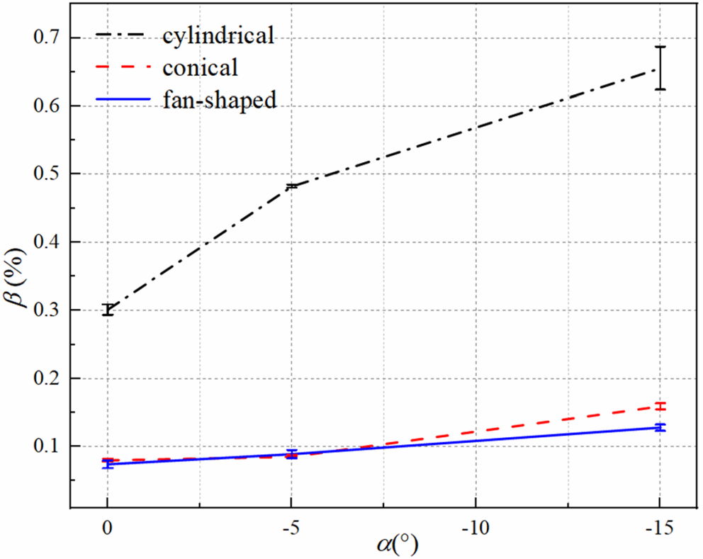 为了进一步验证锥形、扇形等孔型在减少微颗粒沉积方面较强的鲁棒性,本文在不同平板攻角下,研究了其表面微颗粒沉积。实验结果表明,在不同攻角条件下,锥形、扇形等孔型引起的微颗粒沉积分布仍然比圆柱孔要在展向上均匀(类似于图2所展示的那样)。需要指出的是,随着攻角大小的增加,虽然迎风面积增加,但微颗粒沉积仍然集中在气膜孔下游,可见气膜冷气与主流相互作用是引起微颗粒沉积主要因素。图4给出了不同攻角条件下具有不同气膜孔型平板表面微颗粒沉积率。可以看出,随着攻角大小的增加,对于所有孔型而言,微颗粒沉积都增加。但是,很明显,在不同攻角条件下,锥形、扇形孔引起的沉积量要比圆柱孔要小得多,同时,攻角大小的增加并未引起锥形、扇形孔型平板表面微颗粒沉积量的明显增加,进一步说明了这两种孔型在减少微颗粒沉积方面具有较强的鲁棒性。