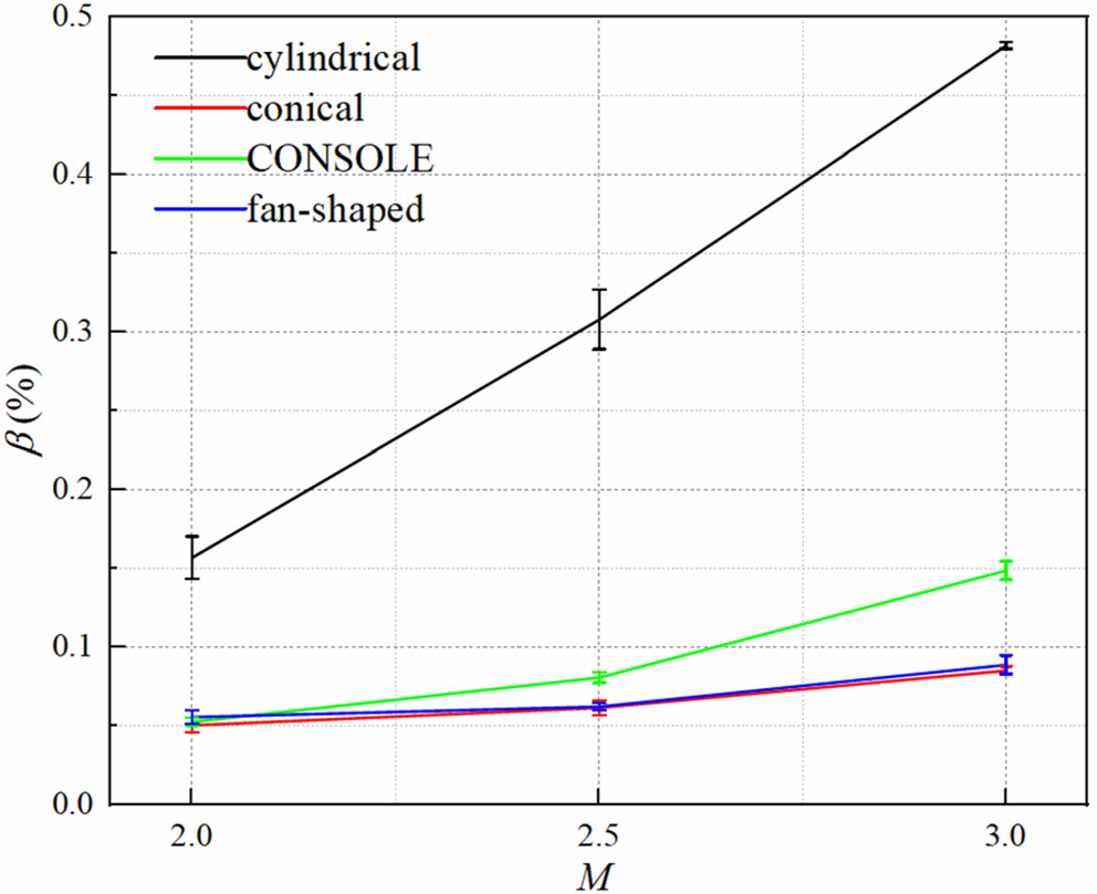 本文在不同吹风比和攻角条件下,研究了几种典型气膜孔型对微颗粒沉积的影响。可以发现,相对于圆柱孔而言,锥形、扇形、CONSOLE等孔引起的微颗粒沉积在展向上要均匀一些,块状沉积明显减少,这一点能够减少微颗粒沉积对气膜冷却带来的风险。而且,锥形、扇形、CONSOLE等孔(尤其是前两者)引起微颗粒沉积量要比圆柱孔小得多,这也有助于减少微颗粒沉积对气膜冷却带来的风险。同时,锥形、扇形、CONSOLE等孔随着吹风比或攻角增加,其引起的沉积量并未明显增加,表现出了较强的减少风险的鲁棒性。本文虽然基于气膜冷却流动机理说明了这几种孔引起的微颗粒沉积特性的差别(详见论文),由于实验上难以同时获得详细的流动结构,并未给出定量的说明,将在后续研究中结合数值模拟进行更为 深入的研究。