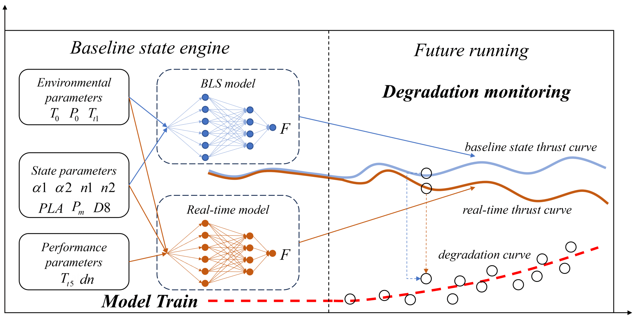团队首先将数字孪生技术应用于航空发动机机载推力性能衰退的实时监控,发展了包含推力等机载不可测量参数的虚拟传感器技术,实现了对推力等参数的虚拟测试,并通过建立的基线模型,开发了机载性能监控预警系统,实现了对航空发动机推力等性能衰退的实时监控和预警。该研究成果发表于《Reliability Engineering & System Safety》。