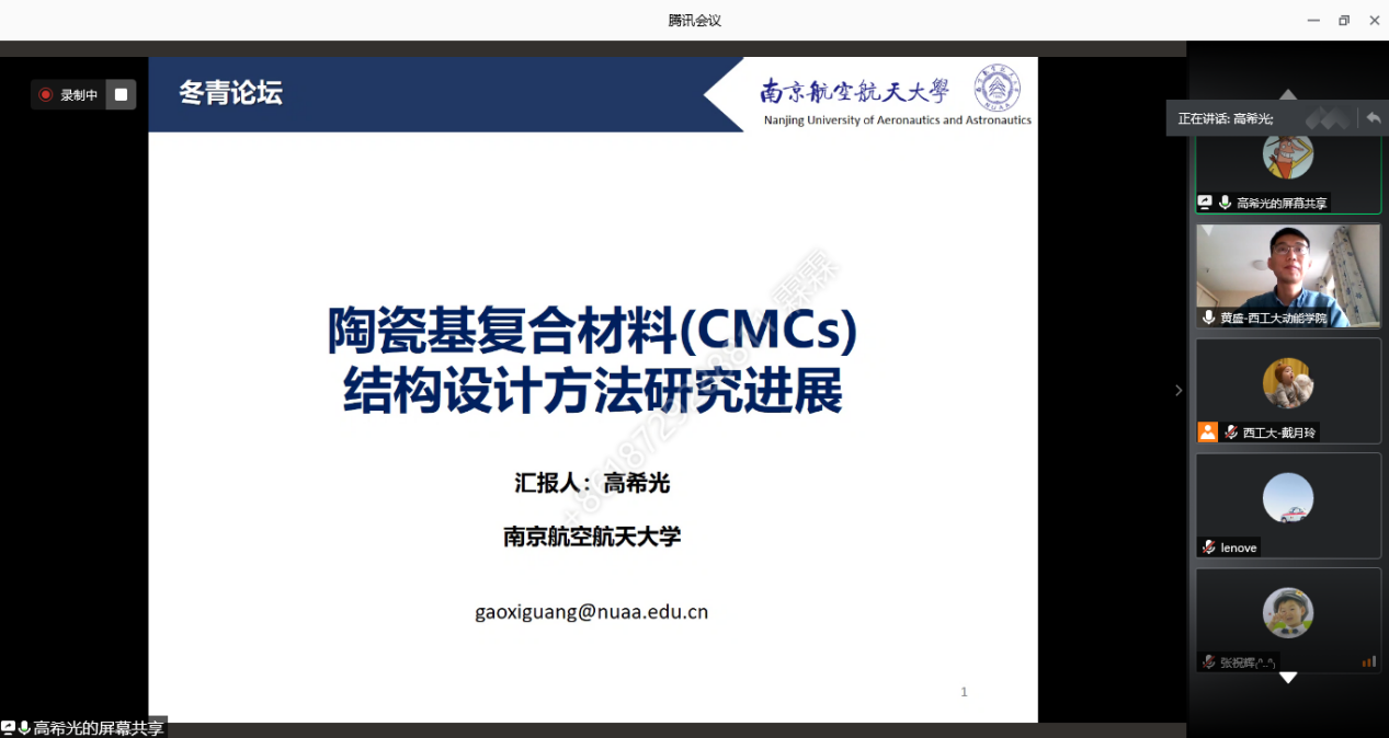 高希光教授系统介绍了陶瓷基复合材料结构设计方法研究进展,包括CMC结构的多尺度建模、本构模型、强度模型、疲劳寿命模型以及振动的计算,最后高希光教授与参会老师和同学们进行了深入的交流讨论。
