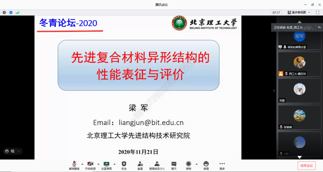 应冬青学会邀请,2020年11月21日,北京理工大学梁军教授和南京航空航天大学高希光教授分别针对复合材料研究中的热点和难点问题,对《先进复合材料异形结构力学性能表征与评价》和《陶瓷基复合材料结构设计方法研究进展》进行了精彩讲授。