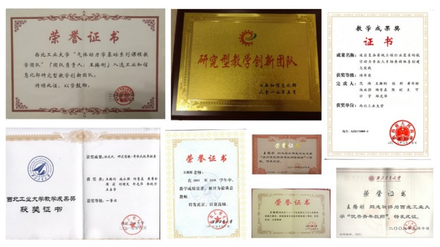 教学成果一等奖(2项)、宝钢优秀教师奖、陕西省教学成果特等奖和一等奖,负责的“气体动力学基础系列课程教学团队”入选了工信部研究型教学创新团队。