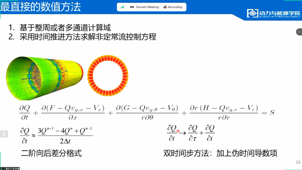 王丁喜教授指出最为直接的非定常流定量评估方法是基于多通道甚至整周计算域,采用双时间步方法在时域直接求解非定常流控制方程。但是这种方法需要消耗大量的内存资源,并且计算耗时长,不适用于工程日常设计对方法时效性的要求。尽管如此,叶轮机内非定常流具有一些独特的时空特性。这些时空特性可以加以利用来发展高效率的数值方法。