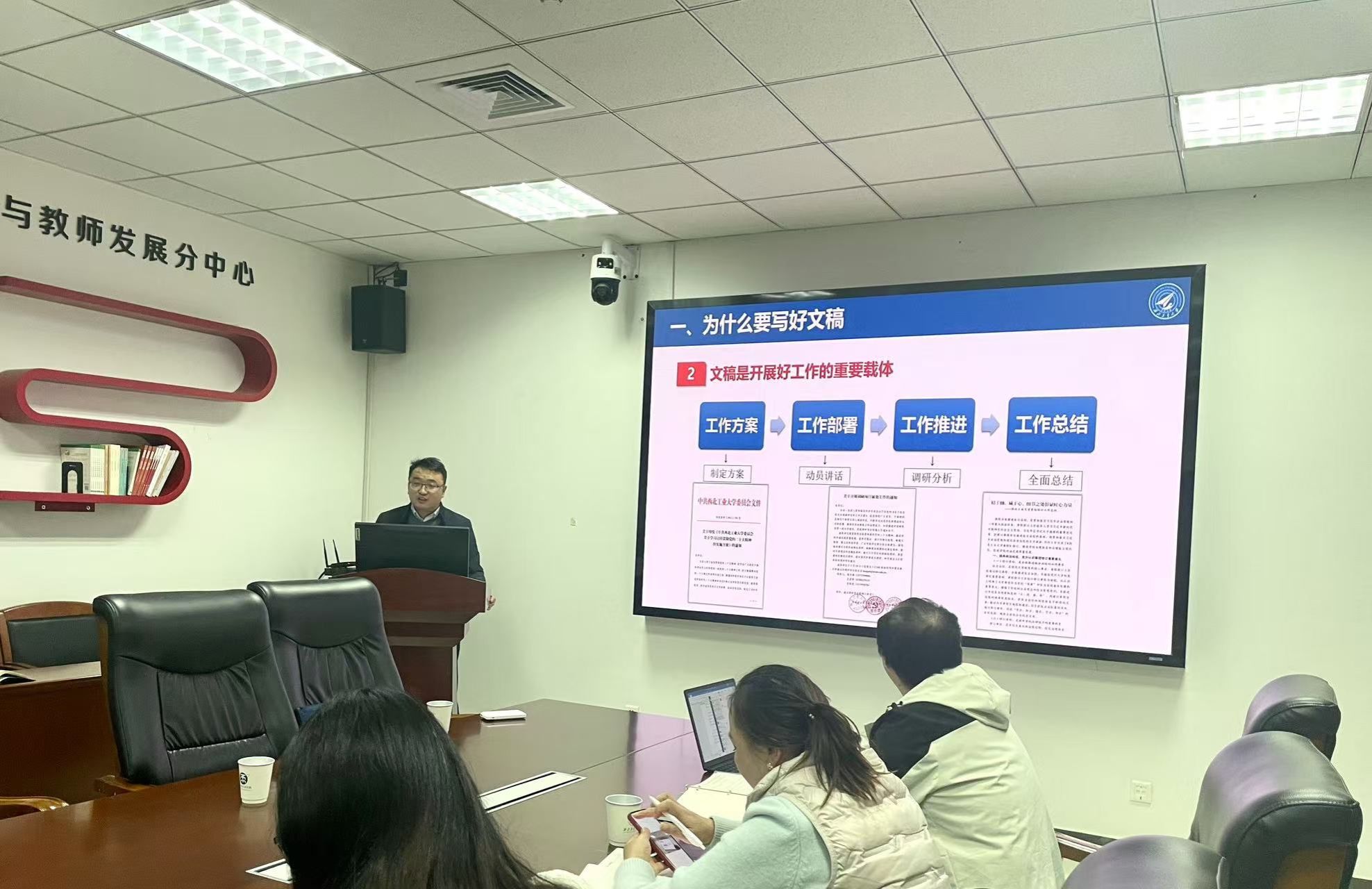 党委副书记徐永超从为什么要写好文稿,如何写好文稿两方面进行讲解,并以大型报告,工作总结,会议致辞为例详细讲解了文稿写作的方法和要素,深入浅出的见解引发与会成员的思考。