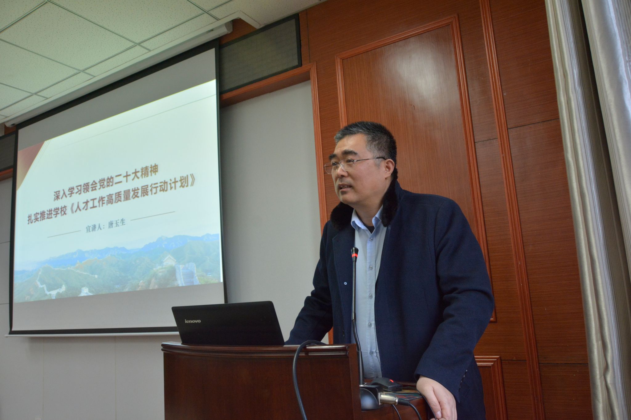 唐玉生同志从举旗定向深入学习宣传贯彻党的二十大精神,知行合一扎实推进学校《人才工作高质量发展行动计划》等两个方面进行宣讲。他从党的二十大报告原文出发,就党的二十大精神的丰富内涵和重大意义进行了详细解读。并结合学校人才工作情况,细致解读了《人才工作高质量发展行动计划》从“四个方面问题”、“六个进一步”到“二十条举措”的落实情况。他指出,要把进一步完善党管人才的工作格局、加强对人才的政治引领和政治吸纳、强化学校人才服务保障、突出重点领域引才、创新完善引才工作机制、加大人才对外开放力度等20个方面统筹谋划,立足学科发展,结合学院实际,细化方法举措,为实现一流人才队伍建设目标贡献力量。