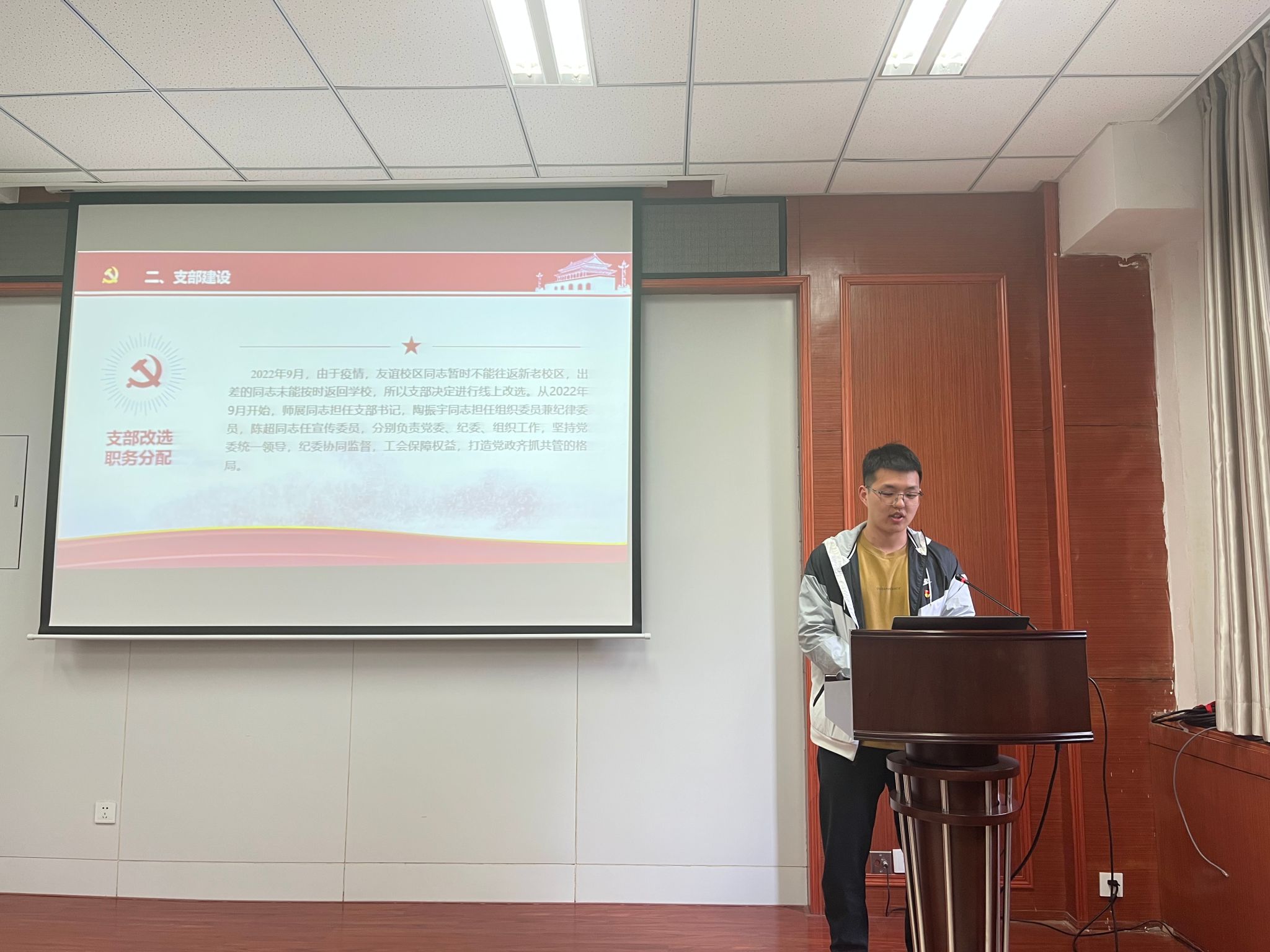 最后,闫育周书记对各支部书记的述职进行了点评和总结。他强调,各支部书记要以此次述职评议考核为契机,认真谋划今后的支部工作,针对存在的问题,列出清单,提出整改措施;各党支部要积极探索党建工作的新方法、新途径,结合实际,大胆创新,不断提升党建标准化工作的水平和工作实效。通过本次述职评议,支部之间可以相互学习交流总结经验,从而进一步推动全面从严治党向基层延伸,加强基层党组织建设,真正把党支部建设成基层的战斗堡垒。